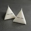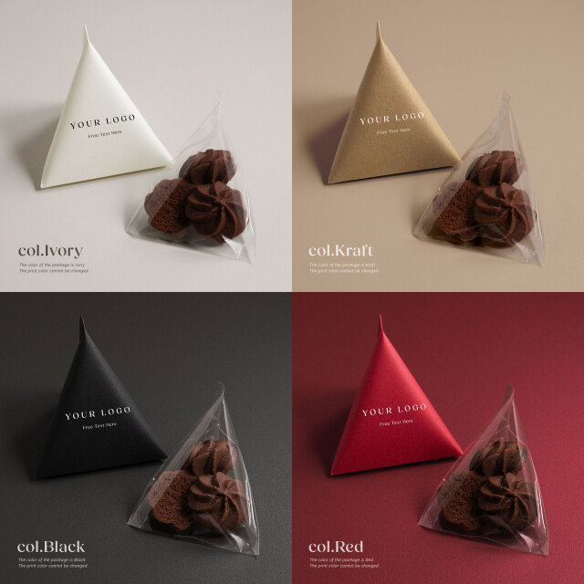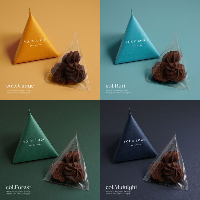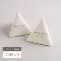 注文数1ロットにつき50枚のテトラパッケージと口を留める割りピンが入っています。テトラパッケージにはご指定のロゴと、任意のフリーテキストを印字したものをお作りします。パッケージカラーは全24色から1ロットにつき1色お選びいただけます。組立後のテトラプチギフトのパッケージサイズは下図の通りとなります。